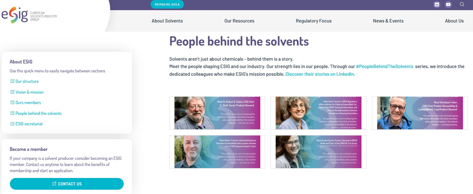 In April 2025, ESIG launched the successful #PeopleBehindTheSolvents campaign on LinkedIn to introduce the dedicated professionals driving innovation, safety, and sustainability in the solvents sector. The series achieved over 2,000 impressions, more than 90 likes, and numerous comments—demonstrating strong interest in the people behind the products.