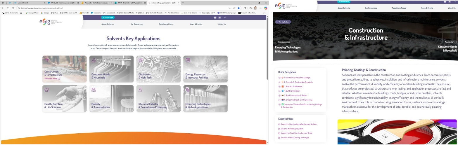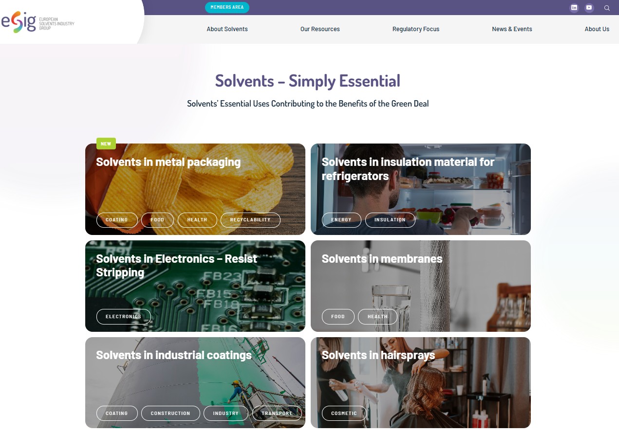 ESIG Website: Centralisation of all available information on solvent applications currently available on the 3 ESIG webpages (Discover Solvents, Essential Use, and Key Applications) into a more structured, centralised format.