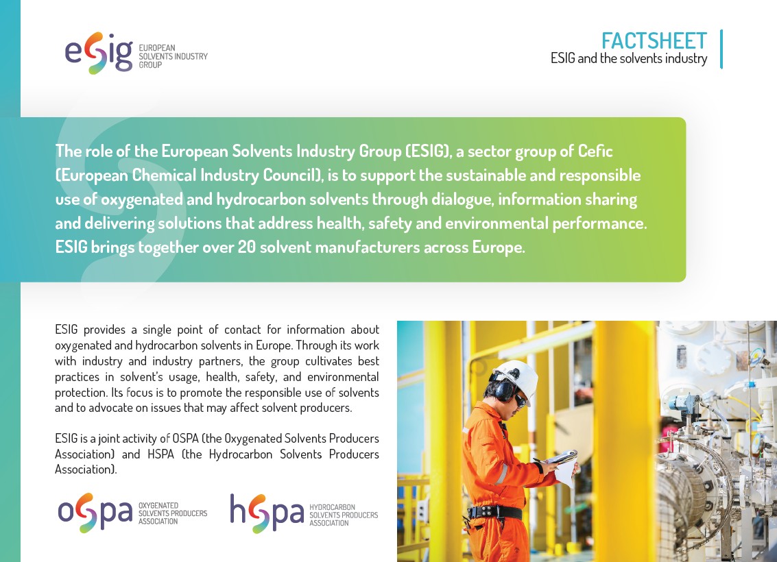 This factsheet published in 2019 and updated in 2024 described the role of the European Solvents Industry Group (ESIG), a sector group of Cefic (European Chemical Industry Council), is to support the sustainable and responsible use of oxygenated and hydrocarbon solvents through dialogue, information sharing and delivering solutions that address health, safety and environmental performance. ESIG brings together over 20 solvent manufacturers across Europe.